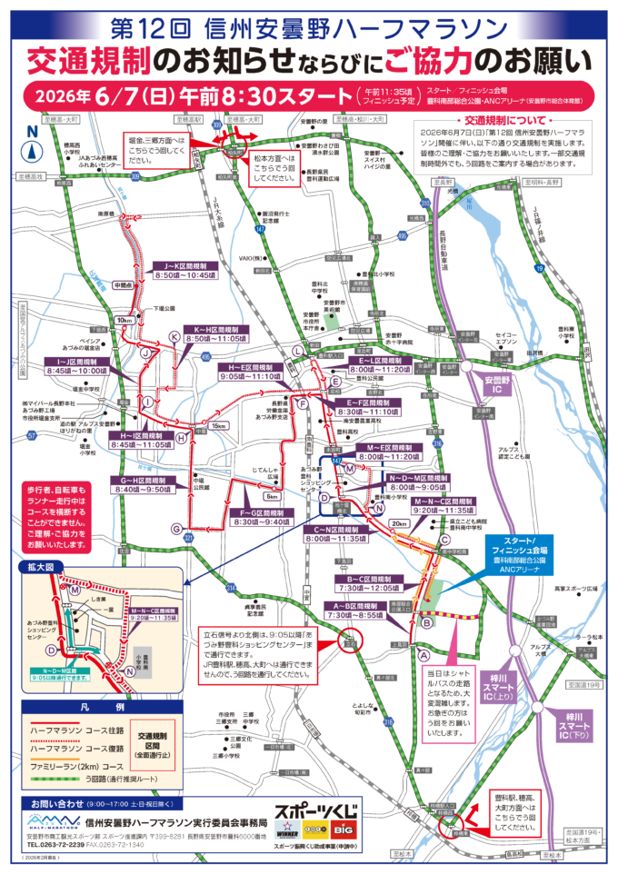 2026年6月7日(日)「第12回信州安曇野ハーフマラソン」の開催に伴い、下記のとおり、交通規制を実施します。 大会当日は大変ご迷惑をおかけいたしますが、何卒ご理解とご協力をお願い申し上げます。