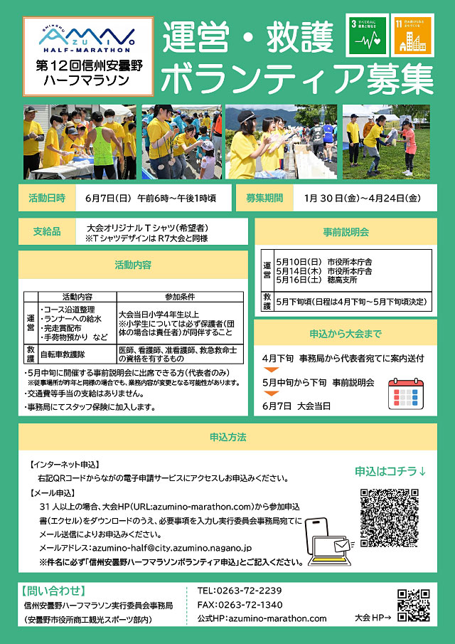 2026年6月7日(日)開催の第12回信州安曇野ハーフマラソンの開催に向け、一緒に大会を支えてくれる運営・救護ボランティアを募集します。「人と自然で安曇野流おもてなし」を大会コンセプトに、信州安曇野ハーフマラソン自慢のボランティアとして参加し、一緒に大会を盛り上げましょう。ご家族やご友人、職場のお仲間での参加も大歓迎です。